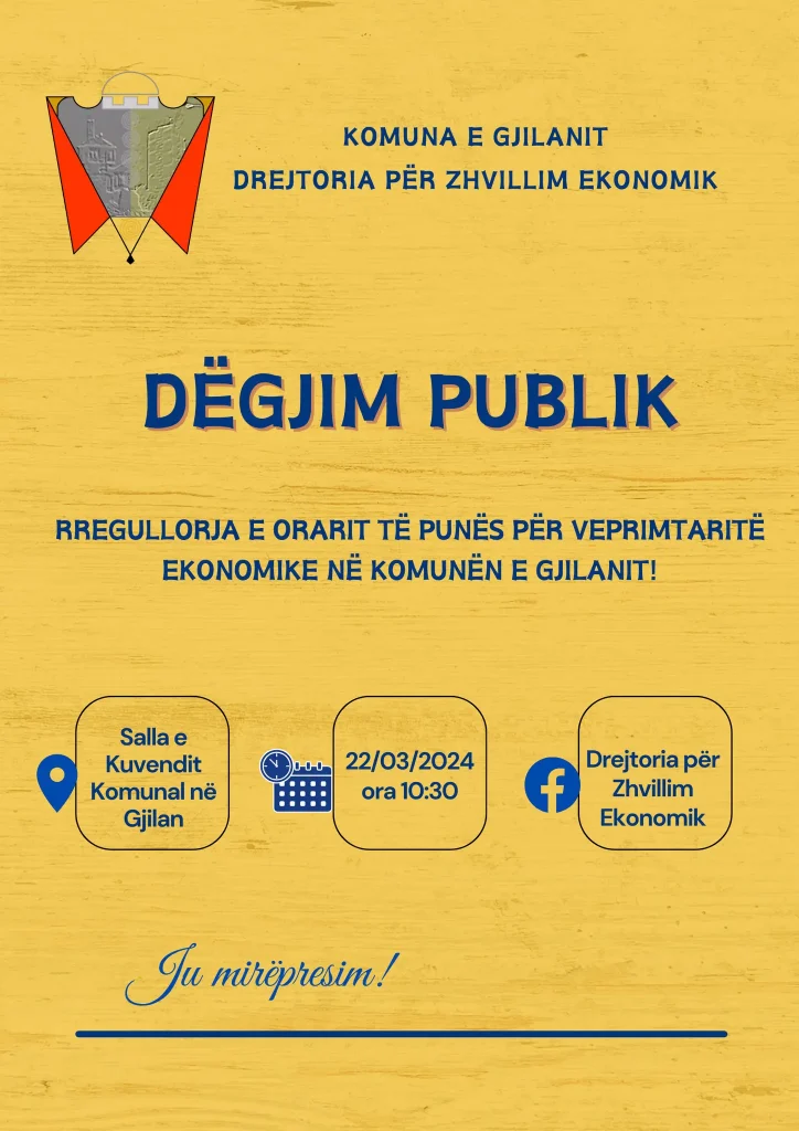 Me kërkesë të Komunitetit të Biznesit për të pasur kohë të mjaftueshme për të dhënë mendimet, komentet e tyre rreth : Rregullores për Fillimin dhe Mbarimin e Orarit të Punës të Subjekteve Afariste në Territorin e Komunës së Gjilanit!
